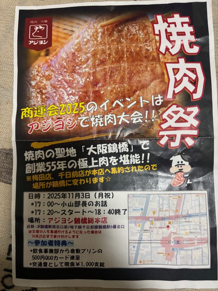 本日、大阪運輸部の商運会2025のイベントは「アジヨシ」で焼肉大会が